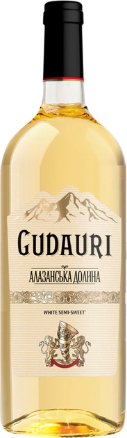 Gudauri Алазанська долина біле напівсолодке 1.5 л відрізняється світло-золотистим кольором з прозорим блиском. В ароматі розкриваються ноти стиглої груші, білого персика та яблука, доповнені тонкими квітковими відтінками та легким медовим нюансом. Букет м'який, виразний та свіжий, без зайвої нав'язливості.